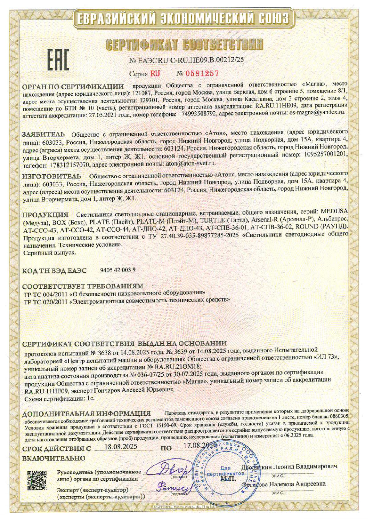 Все светодиодные светильники Атон проходят строгий контроль качества на каждом этапе производства. Мы используем только проверенные материалы и компоненты, что позволяет гарантировать долговечность, энергоэффективность и безопасность продукции. Сертификаты подтверждают соответствие требованиям ГОСТ, Технического регламента Таможенного союза и других нормативных документов.